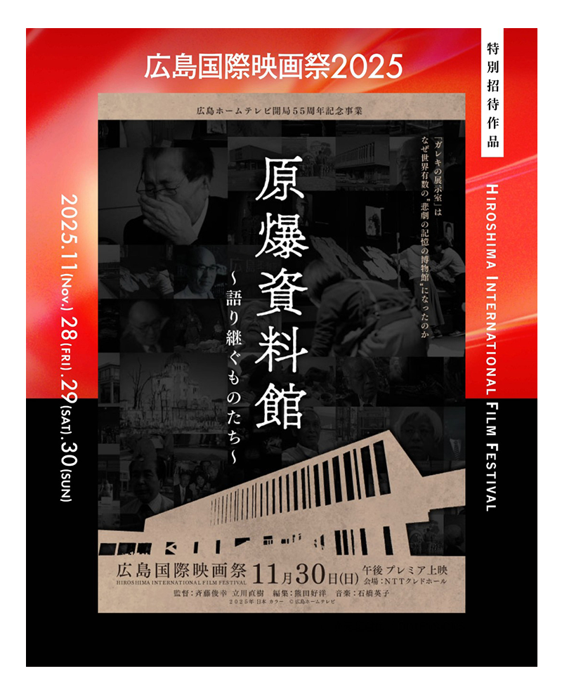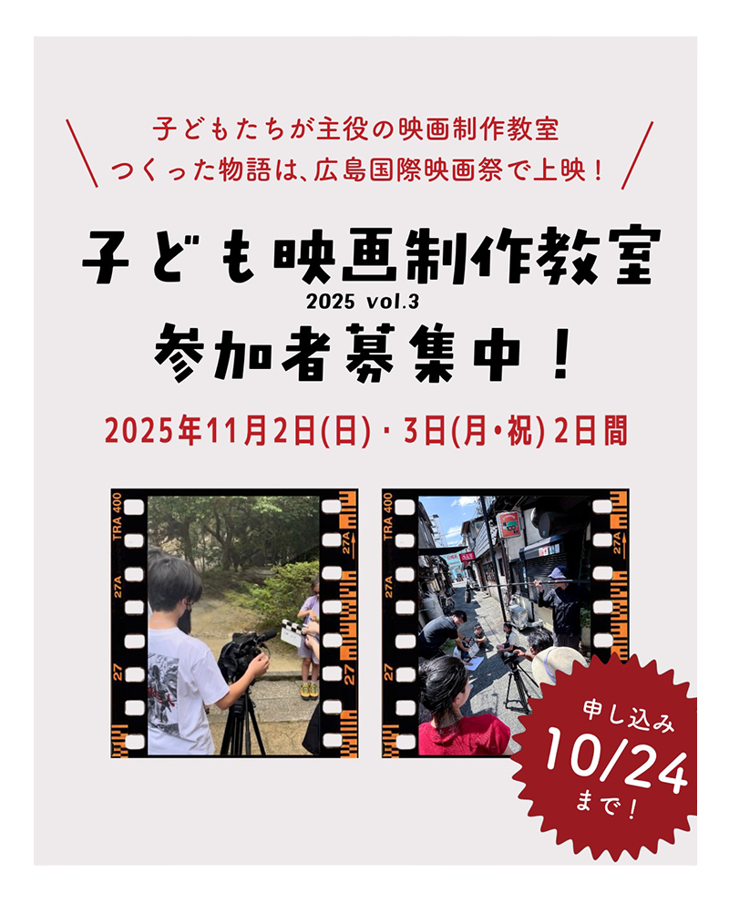 NEWSVIEW MOREVIEW MORE 2025.10.16 広島のもう一つの悲劇を見つめる映画 谷口広樹監督作品『神の島』 上映決定 2025.10.15 クロージング作品『原爆資料館 〜語り継ぐものたち〜』 ワールドプレミア上映決定 2025.10.14 ドキュメンタリー作品『日系カナダ人物語 A Nikkei Canadian Story』 2025.10.10 子ども映画制作教室2025 参加者募集! 2025.10.09 金子雅和監督最新作『光る川』上映決定 2025.10.08 広島出身・土井裕泰監督『片思い世界』をバリアフリー版として特別上映決定