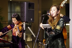 11月25日(土)21:00からNTTクレドホールのロビーで、taca-WoodBlast with 佐々木優樹とSEiRENのミュージックライブが行われました。最初はtaca-WoodBlastの演奏でマカフェリギター、コントラバス、アコーディオンによるユニットです。ジプシー音楽というジャンルで、テンポの激しい変化、旋律の装飾、細かいリズムなどを特徴としています。