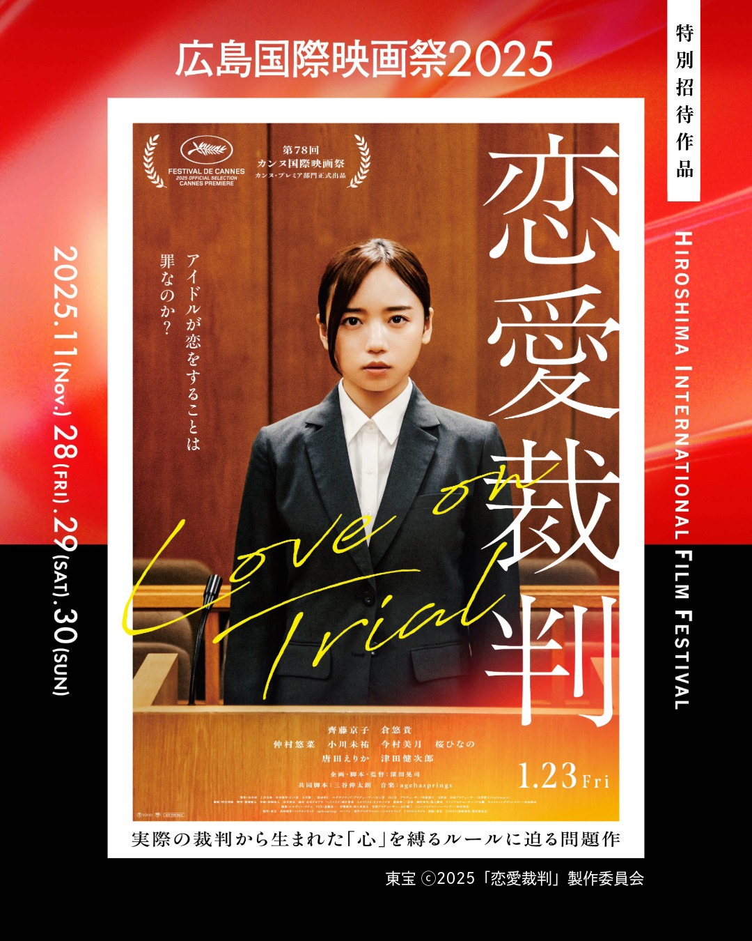 『淵に立つ』『本気のしるし』の深田晃司監督が、日本の現代社会におけるアイドルの“恋愛禁止”というテーマに挑む話題作『恋愛裁判』が、来年1月23日の劇場公開を前に、広島国際映画祭2025で上映されます。