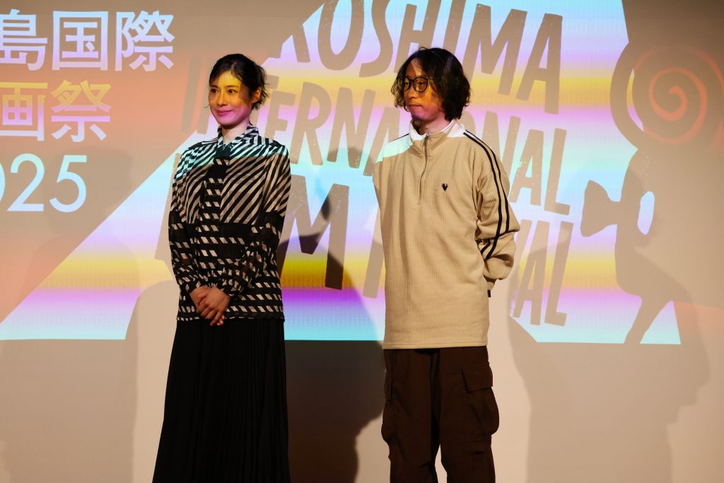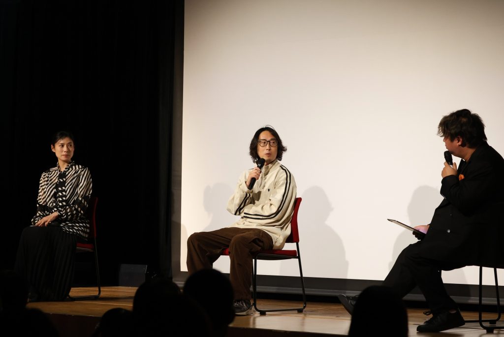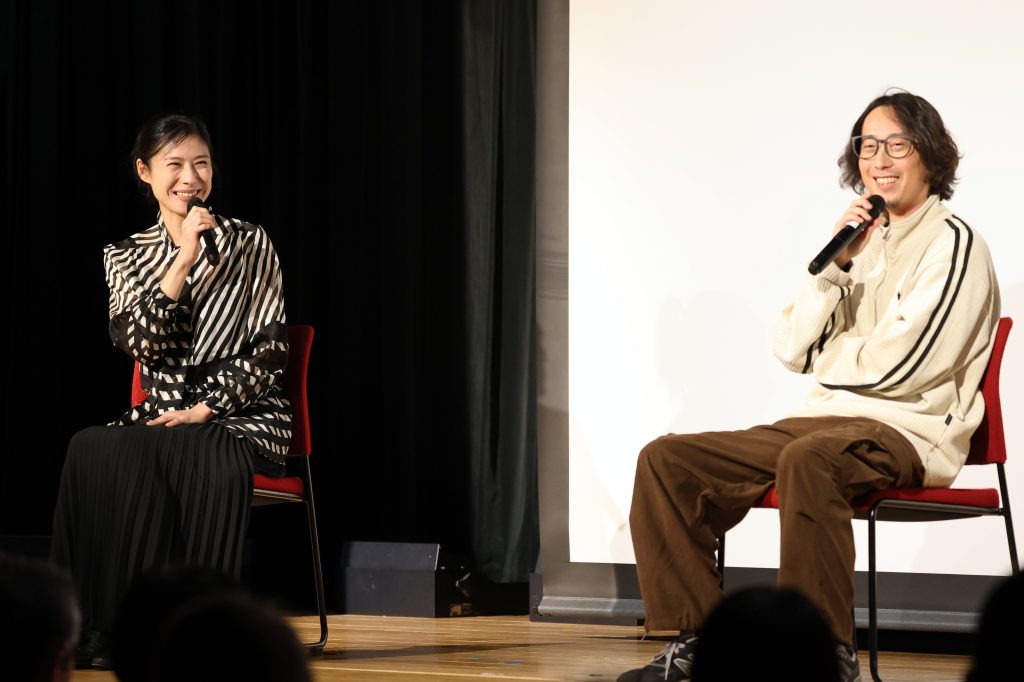 上映後には、山岸謙太郎監督とゲストの遠藤裕美さんによるトークショーが行われました。聞き手はプロデューサーの水野上雄一さんです。 最初の話題は、山岸監督と遠藤さんの広島との関わりについてです。遠藤さんは「いつか訪れたい街だった。撮影時には広島の方の温かさを感じた」と語りました。また、山岸監督は「撮影で初めて広島県に来た。映画の撮影時はスケジュールに余裕が無かったので、今回は観光してみたい」と期待を膨らませました。
