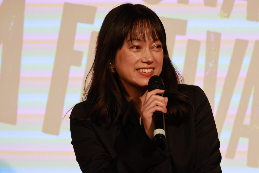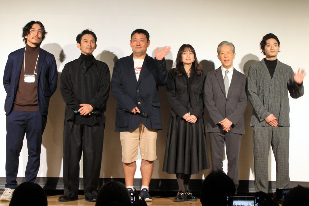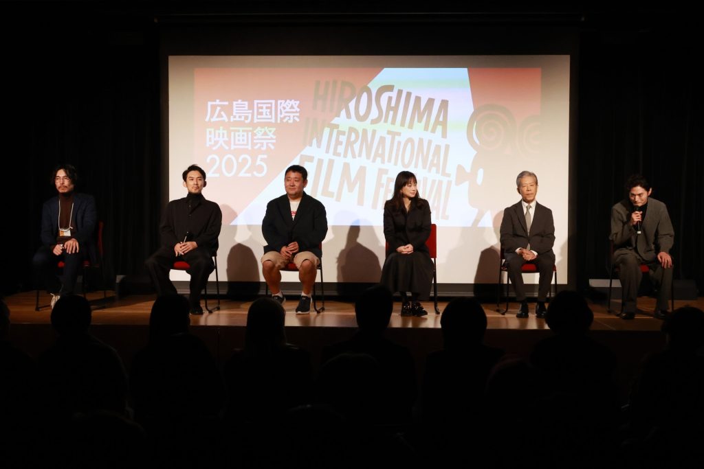 上映後には、客席で鑑賞していた主演の松林慎司さん、ドロンズ石本さん、佐伯日菜子さん、岡本信人さん、篠田諒さんが登壇し、観客から温かい拍手が送られました。聞き手は映画コメンテーターの鈴木由貴子さんが務め、終始和やかな雰囲気でトークが展開されました。 撮影を振り返り、苦労したシーンについて問われると、佐伯さんは「関東出身のため、山口や広島など地域特有の方言のイントネーションが合っているか不安だった」と語りました。それに対して、山口県萩市出身の岡本さんが「本番は完璧で、さすがだった」と称賛の言葉を贈り、会場には笑顔が広がりました。