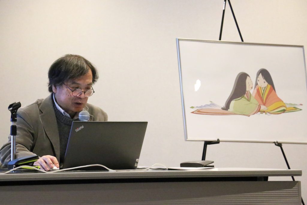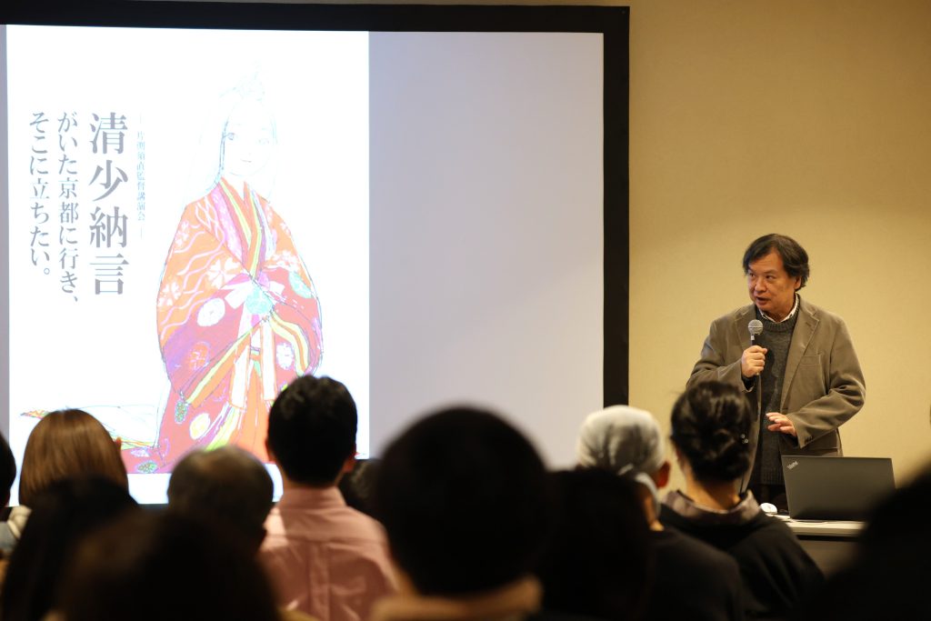 制作過程では、清少納言のおおよその生年、夫である橘則光との関係など、細かな点まで資料に基づいて丁寧に調べ、考察を重ねていることが語られました。特に平安時代の建築を理解するため、江戸時代の老中・松平定信が失脚後にまとめた平安文化の研究資料を参照したことや、京都の地形から内裏の位置や構造を「立体的に」捉える視点を得たという話は、会場でも大きな関心を集めました。講演では、監督自身が集めた膨大な資料の一部もスクリーンで紹介され、作品が生まれていく背景に触れられる貴重な機会となりました。